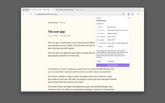Obsidian Web Clipper adalah ekstensi Chrome yang memungkinkan pengguna untuk menyimpan dan menyoroti halaman web dengan mudah. Dengan fitur yang dirancang untuk menjaga privasi dan keamanan, pengguna dapat mengakses konten yang disimpan secara offline. Ekstensi ini mendukung berbagai jenis konten, mulai dari artikel berita hingga resep, dan memungkinkan pengguna untuk menyoroti bagian penting dari halaman yang disimpan. Selain itu, pengguna dapat mengekstrak dan memodifikasi data dengan menggunakan bahasa alami, menjadikannya alat yang fleksibel untuk pengorganisasian informasi.